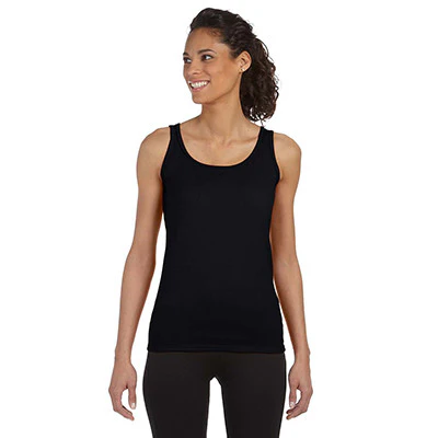 Tank Features: Gildan brand; 100% cotton deluxe 30-singles SoftStyle yarn, Sport Grey is 90% cotton and 10% polyester; 4.5-ounce; wide straps; satin label; rib knit trim applied to neckline and armhole; sideseam construction with stylish tapered cut; double-needle bottom hem; feminine fit.